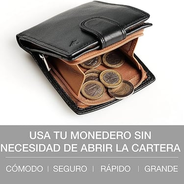 Espacio inteligente para tarjetas, billetes y monedas, ideal para tu día a día con estilo.