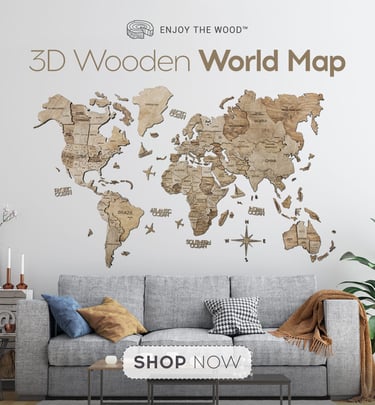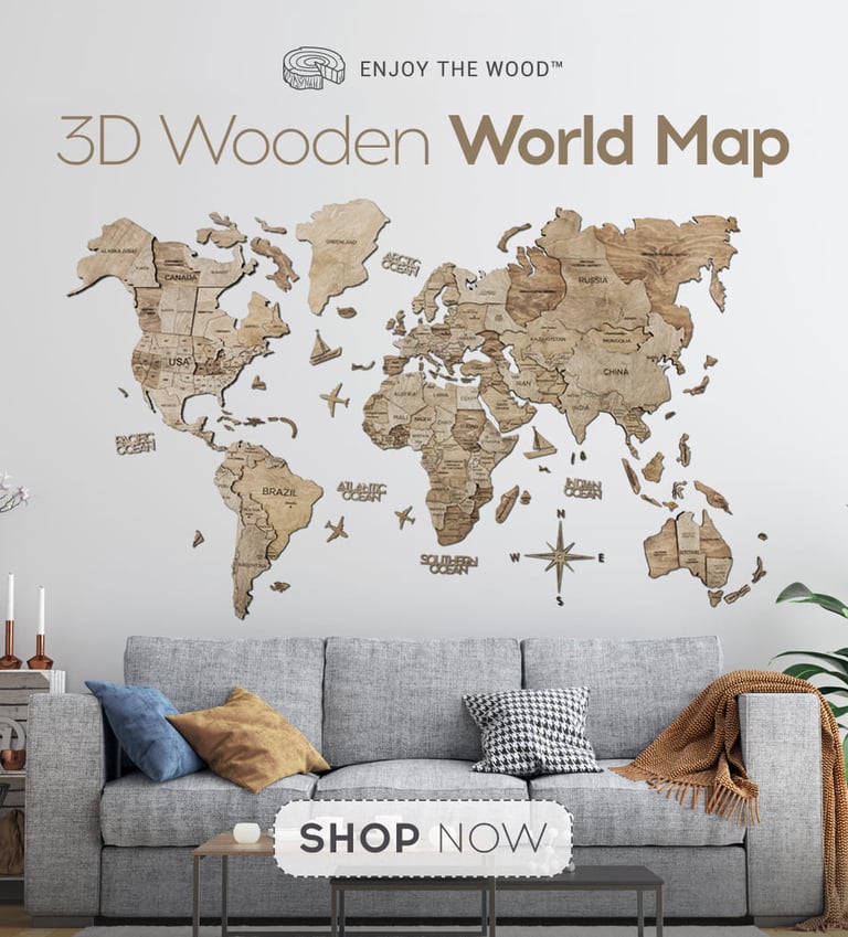 Este mapa del mundo de madera combina arte y diseño moderno para transformar salones, oficinas o dormitorios.